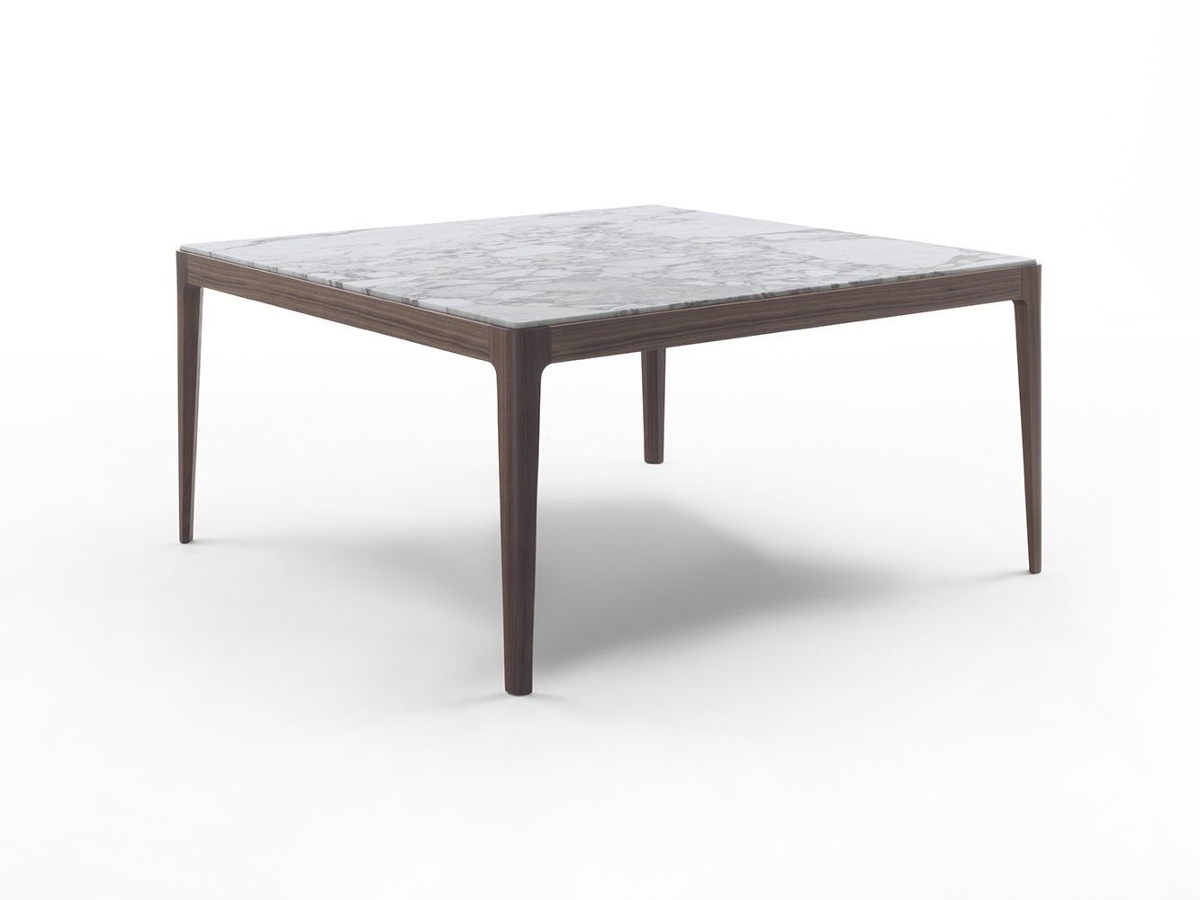 Table à manger carrée avec piètement en noyer canaletta massif et plateau en marbre ou en verre dépoli rétro verni.